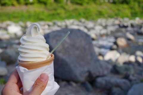 実際の道の駅でも、このソフトクリームは看板メニュー!併設の豆腐店「ほたる」で手作りされており、地場産の大豆と清らかな水を使った豆腐ソフトクリームは、口当たりなめらかで上品な甘さが特徴です。