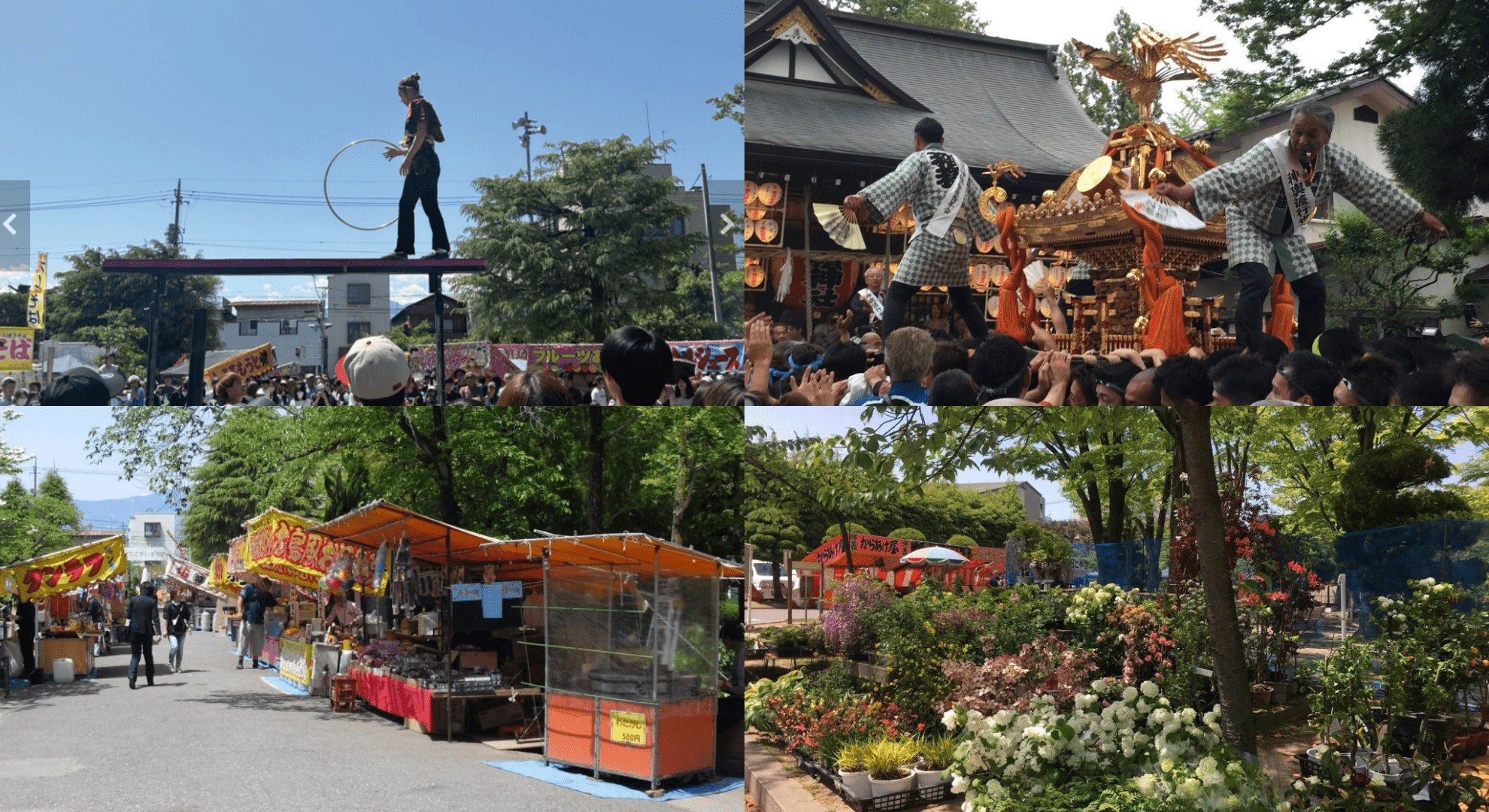 和太鼓演奏や猿回しなど、伝統芸能やパフォーマンスイベントも多数開催され、地元の味覚を味わえる屋台グルメも充実!ゴールデンウィークを楽しく過ごしたい方にぴったりのお祭りです。