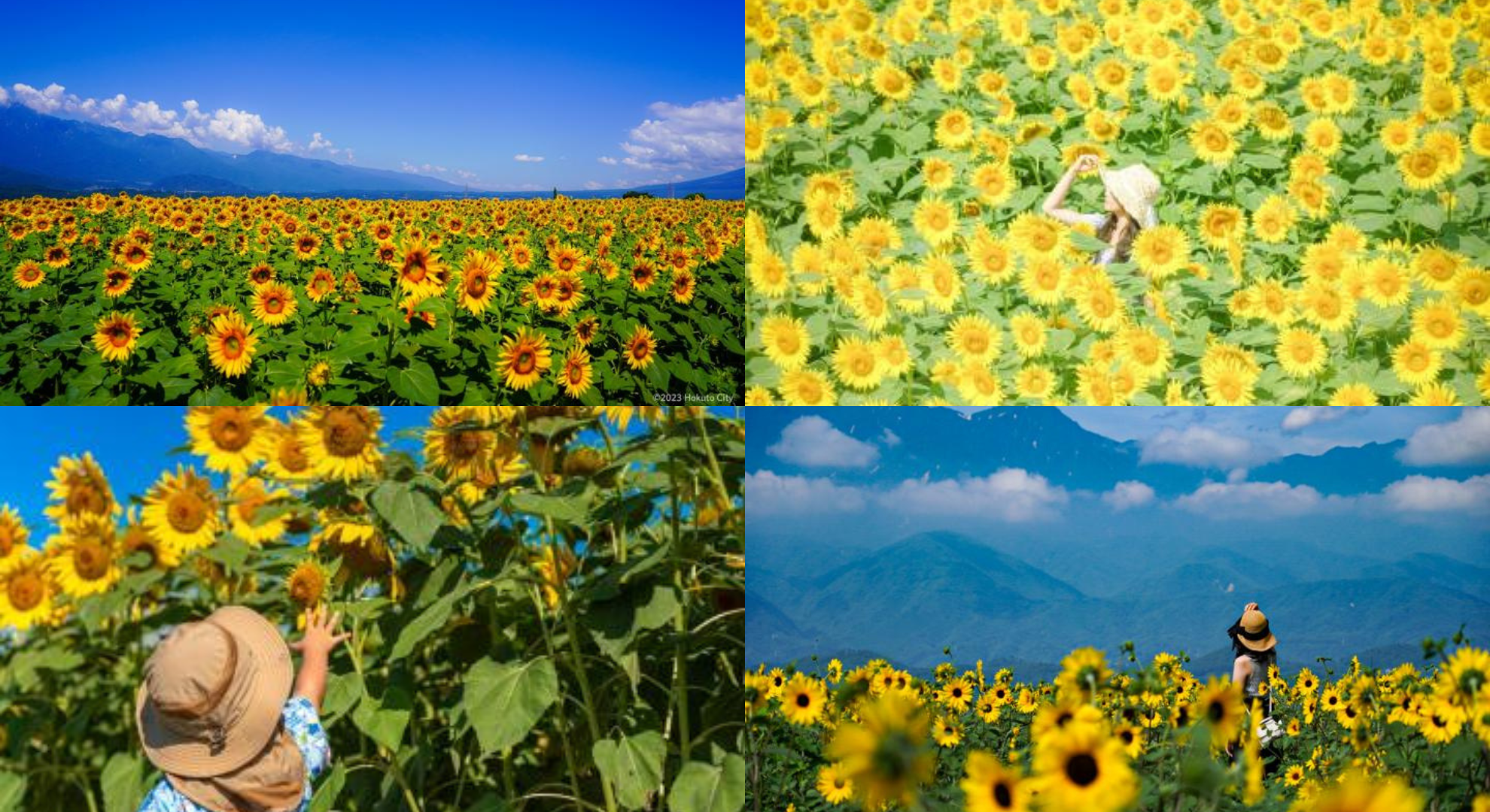 毎年夏に開催される、日本有数のひまわりイベントです。南アルプスや八ヶ岳、富士山を望む雄大な山々を背景に、約60万本ものひまわりが一面に咲き誇ります。