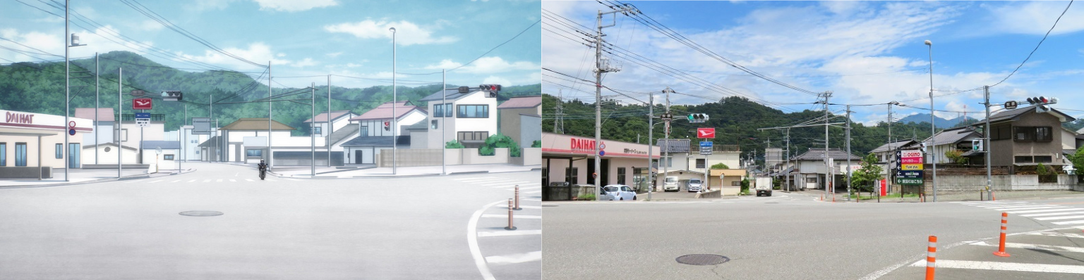 作中では、実際の風景を忠実に再現した看板や道路標識が描かれており、ファンの間では“再現度の高い聖地”として人気のスポット。