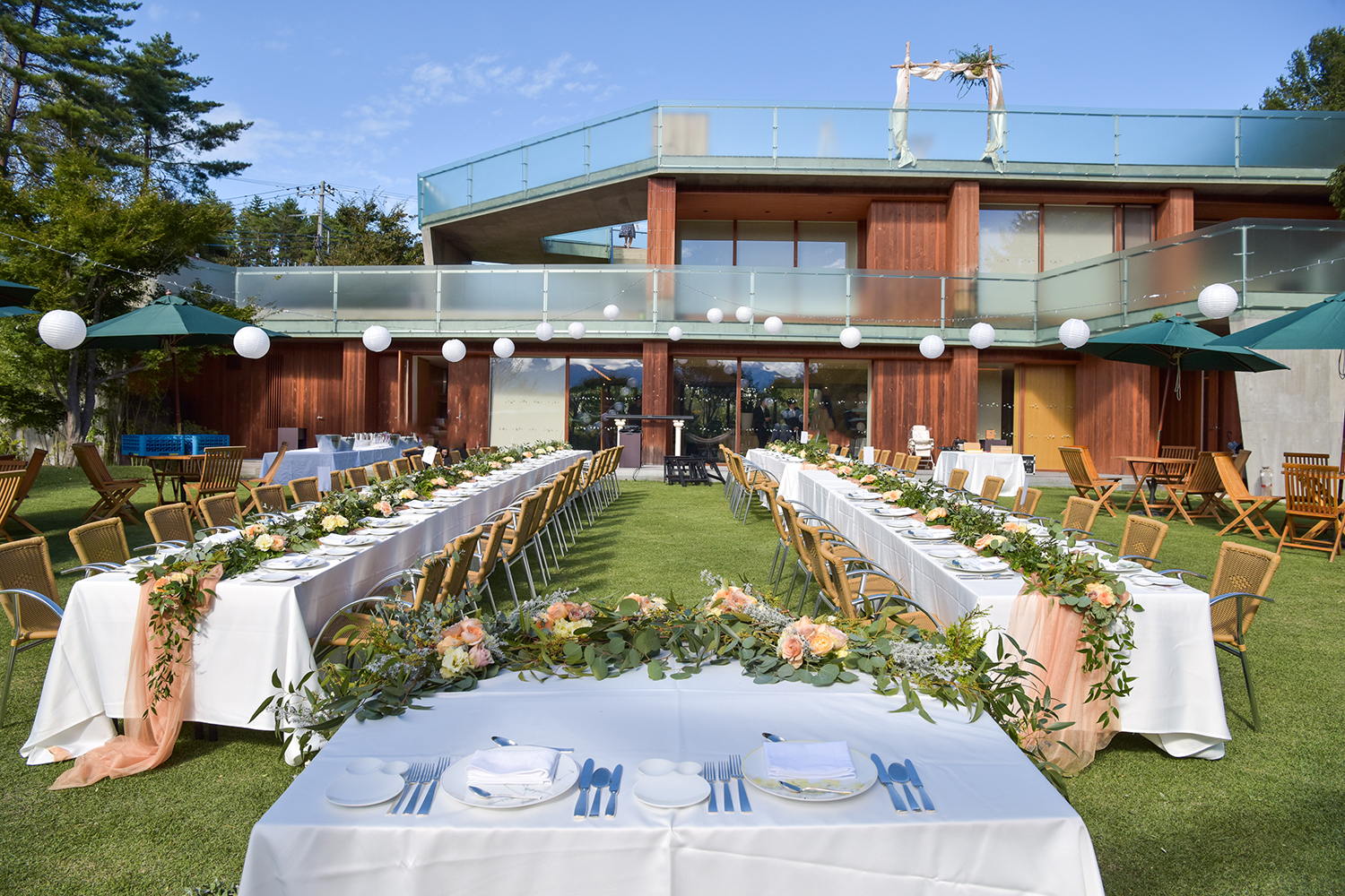 鳴沢村の富士山麓に広がる自然豊かな森の中に佇む、一棟貸切型のホテルウェディング会場です。元撮影スタジオをリノベーションした約3,100㎡の広大な敷地を、1日1組限定で完全プライベートに利用できます。