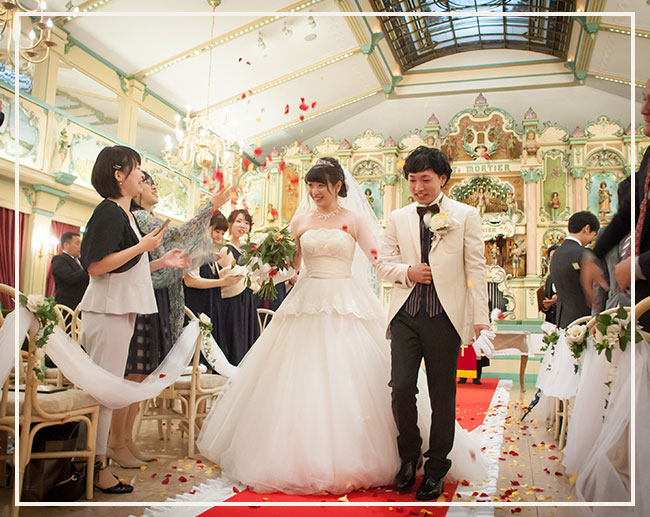 世界最大級の自動演奏楽器「ダンスオルガン」の壮麗な音色に包まれながらのセレモニーは、まるで映画のワンシーンのよう。夜には幻想的なイルミネーション演出で、ゲストにも忘れられない特別な時間になること間違いなしです!